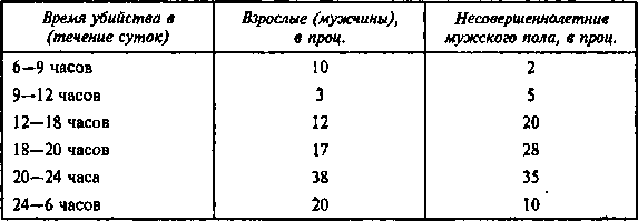 Мужчины сосредоточивают свои усилия на убийствах в квартирах, ресторанах, кафе и закусочных, на железнодорожных вокзалах, поездах дальнего следования и электричках, используют для убийства они и чужой автомобиль (часто угнанный). А несовершеннолетние, как уже отмечалось, активно «орудуют» не только в своих квартирах, но и в подъездах чужих домов, дворах, сараях, также используя для убийства чужой автомобиль (также, как правило, угнанный). Такие места убийств необходимо фиксировать и полученный материал использовать в соответствующей профилактической деятельности. Важно еще, однако, знать, как распределяются убийства по времени в пределах суток.