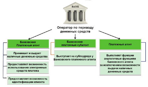 – юридические лица, имеющие статус кредитных организаций или не имеющие такого статуса, – оператор платежной системы, оператор услуг платежной инфраструктуры (операционный и платежный клиринговый центры);