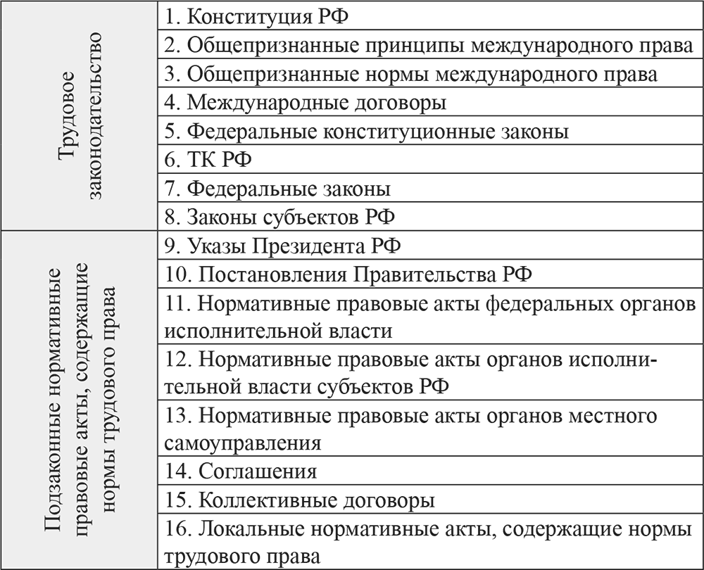 Учитывая то обстоятельство, что ТК РФ недостаточно последовательно изложил систему законов и иных нормативных правовых актов, содержавших нормы трудового права, считаем необходимым привести иерархию нормативных правовых актов в сфере труда по их юридической силе.