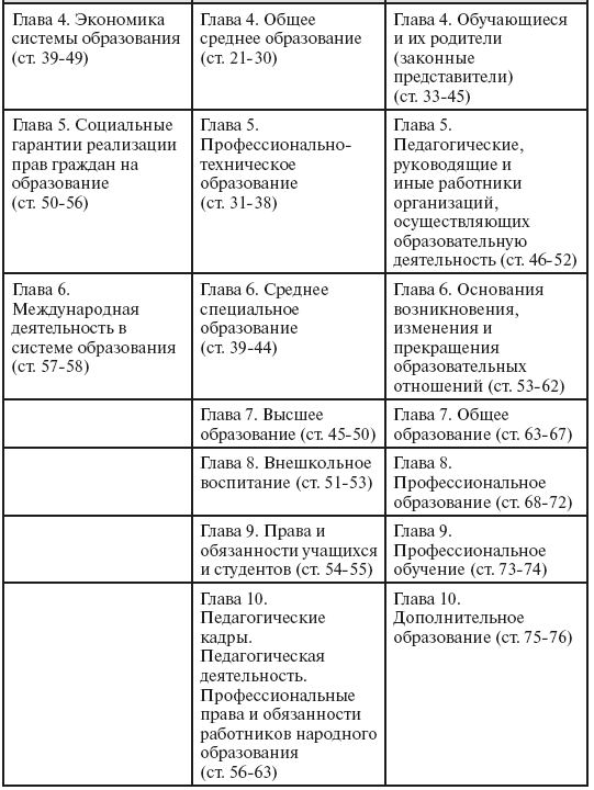 Проведем сравнительный анализ глав Основ, Закона РФ «Об образовании» и Федерального закона «Об образовании в Российской Федерации».