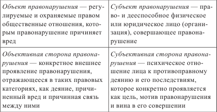 Любое конкретное правонарушение имеет свою теоретическую модель, описанную нормами права, которая называется составом правонарушения. Он представляет собой совокупность следующих элементов: объекта, объективной стороны, субъекта, субъективной стороны.