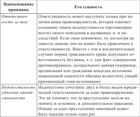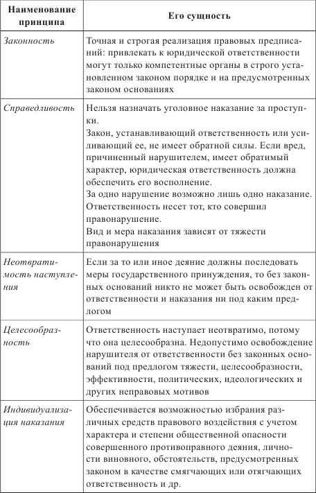 Юридическая ответственность реализуется в строгом соответствии с принципами существующей правовой системы. Они подвижны, разные ученые указывают на разное количество этих принципов: